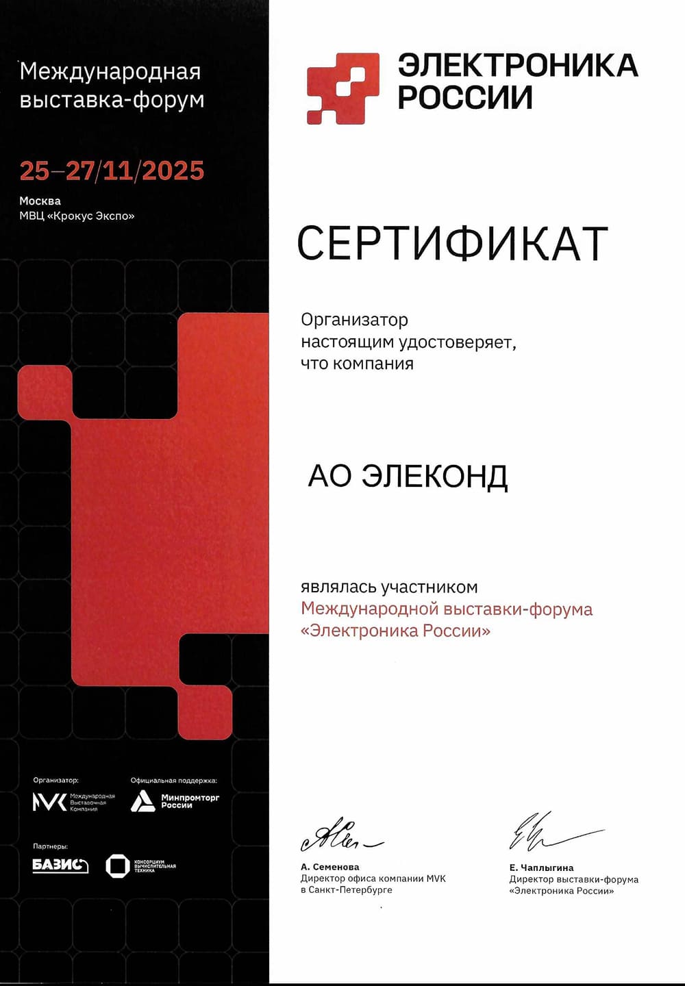 Сертификат участника выставки электронной продукции российского производства «Электроника России— 2025»