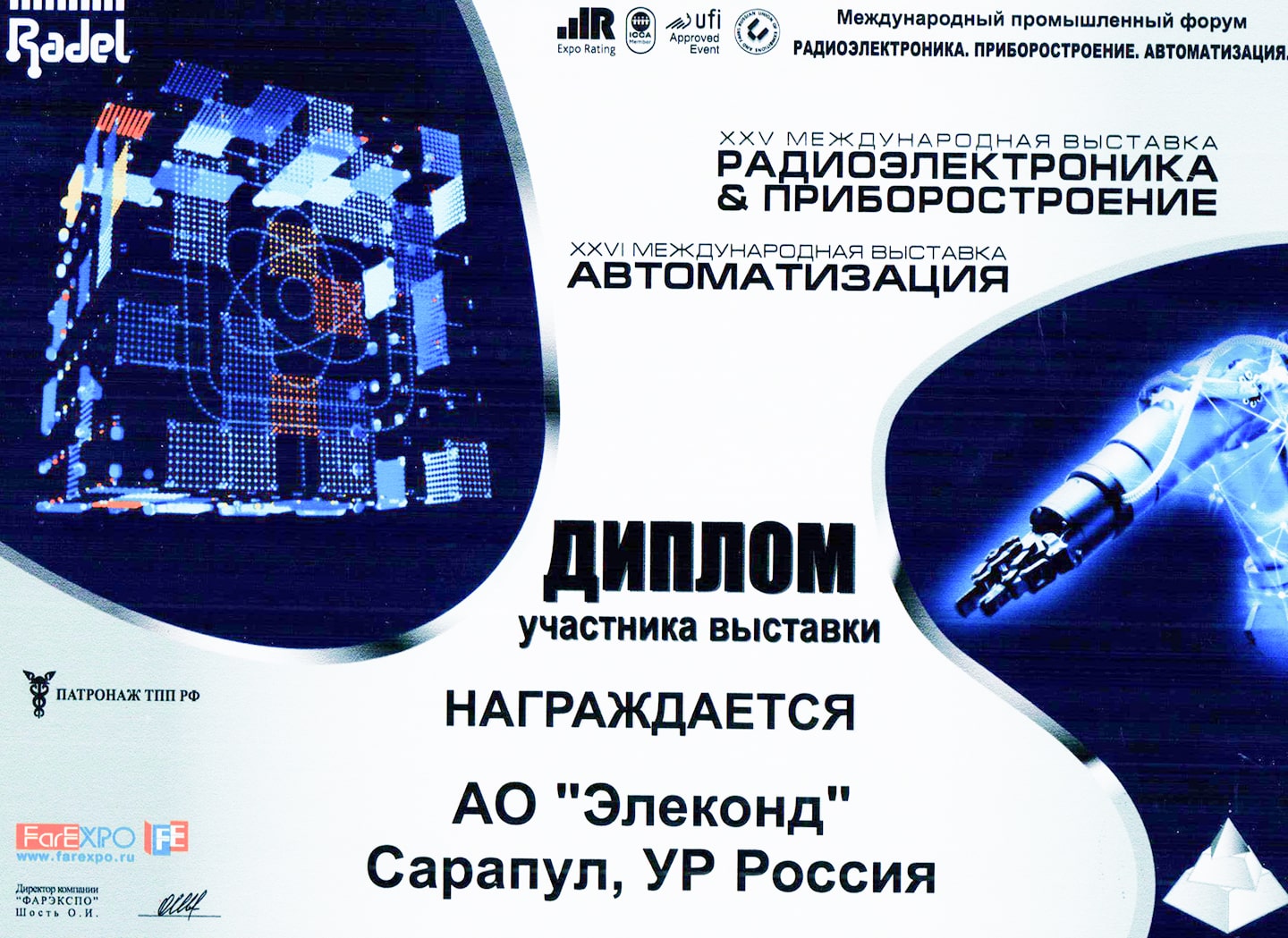 Диплом за участие в XXII международной выставке «РАДИОЭЛЕКТРОНИКА & ПРИБОРОСТРОЕНИЕ»