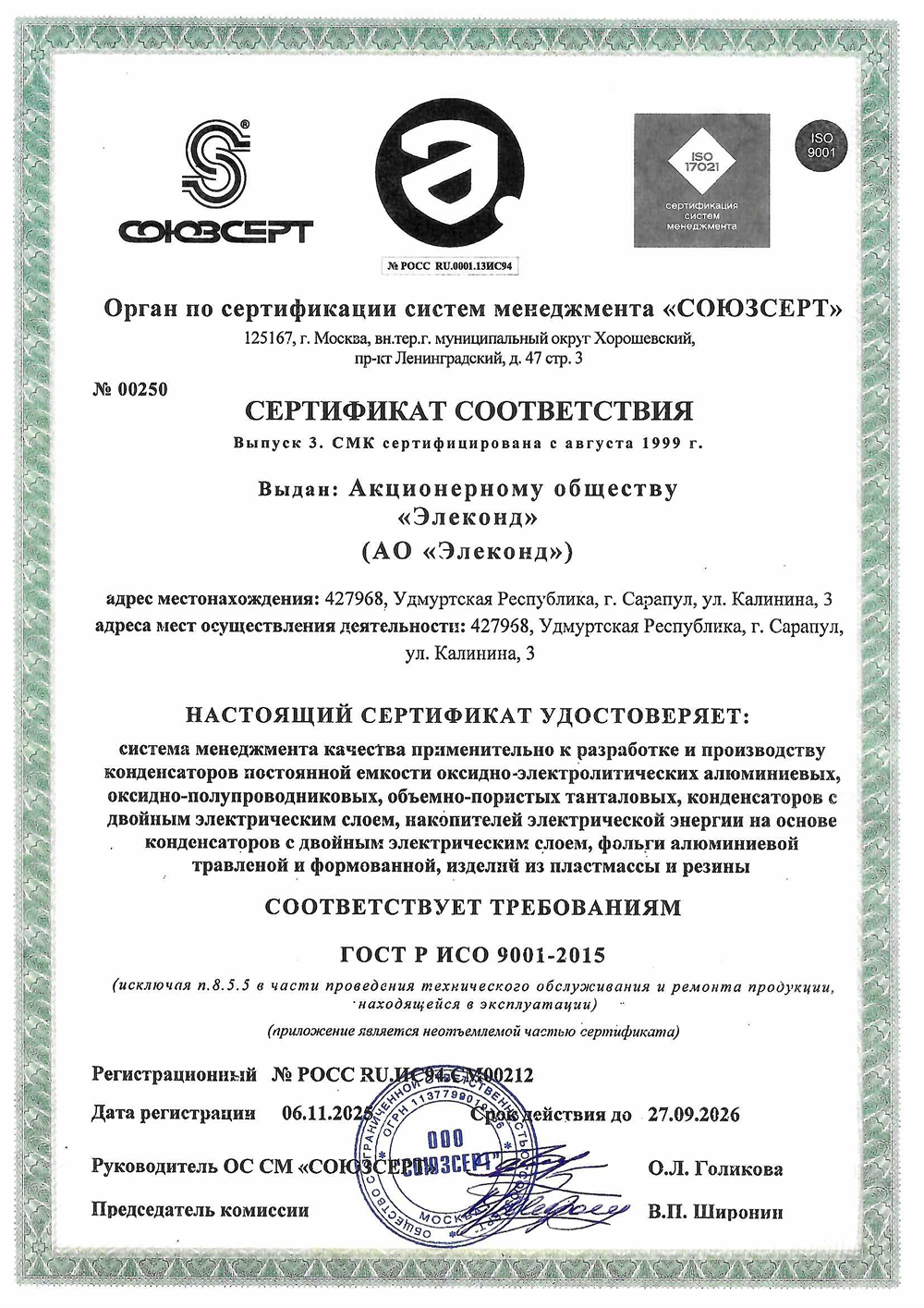 Удостоверяет, что система менеджмента качества применительно к разработке и производству конденсаторов постоянной ёмкости оксидно-электролитических алюминиевых, оксидно-полупроводниковых, объёмно-пористых танталовых, конденсаторов с двойным электрическим слоем, фольги алюминиевой травленой и формованной, изделий из пластмассы и резины соответствует требованиям ГОСТ Р ИСО 9001-2015 (ISO 9001:2015)